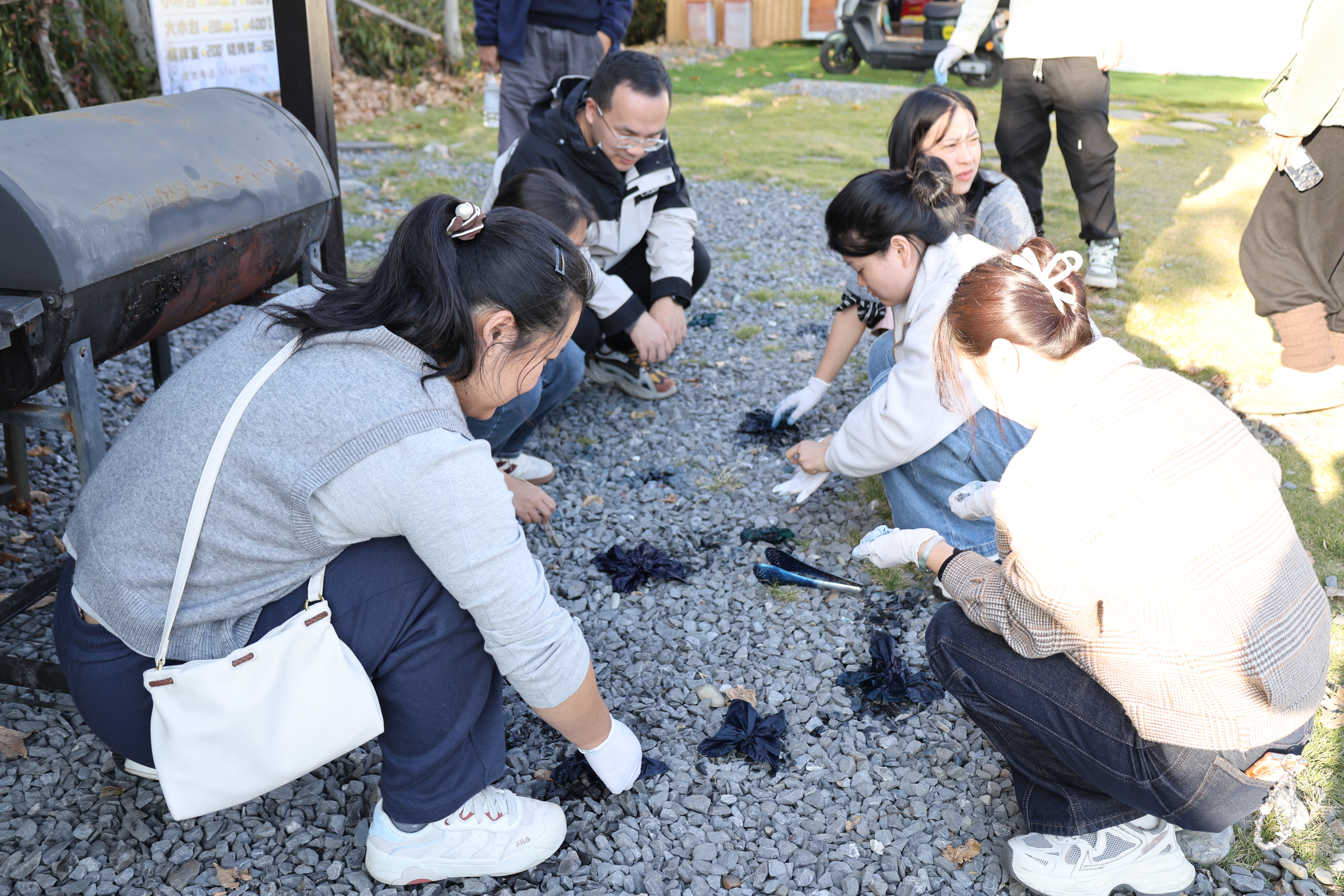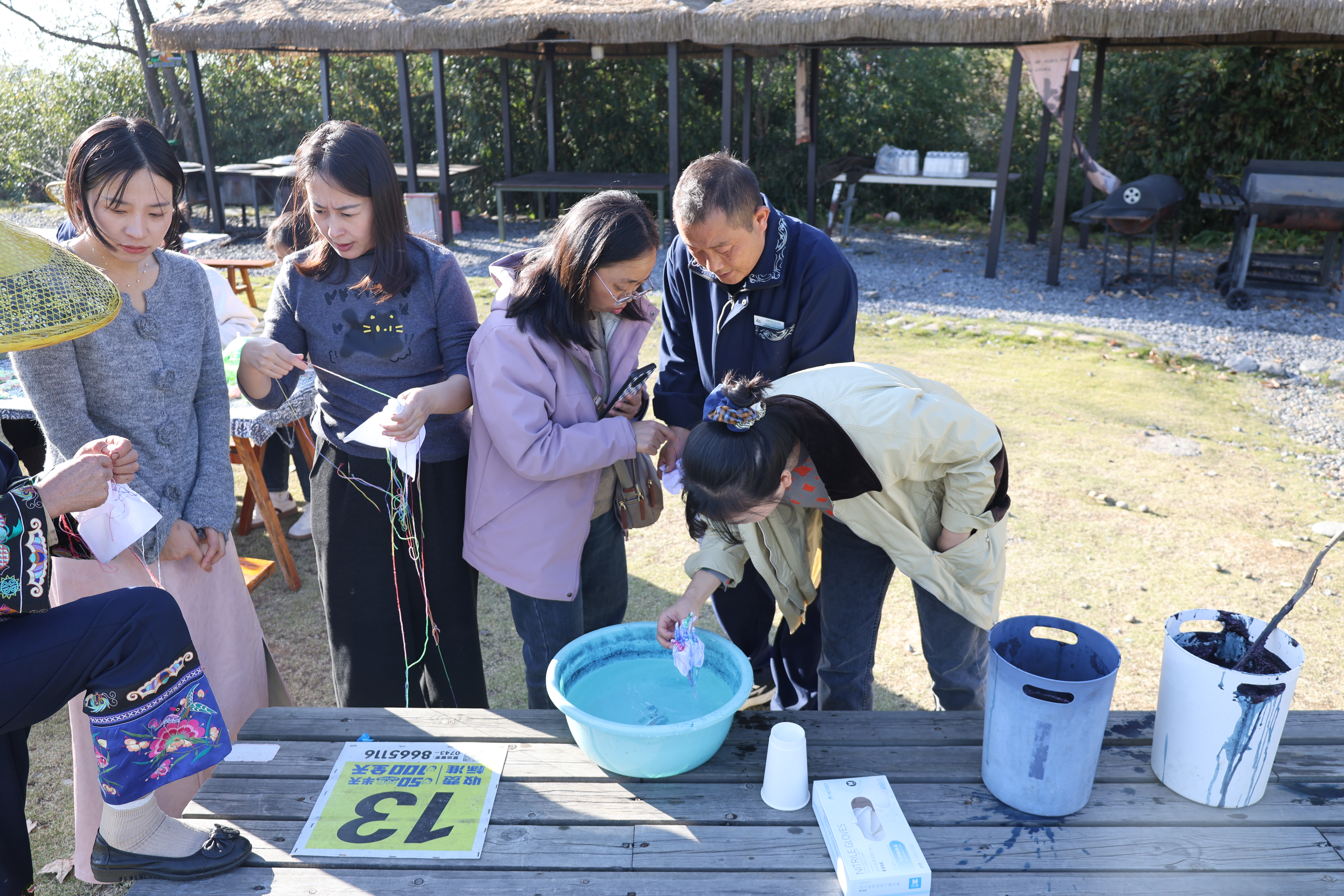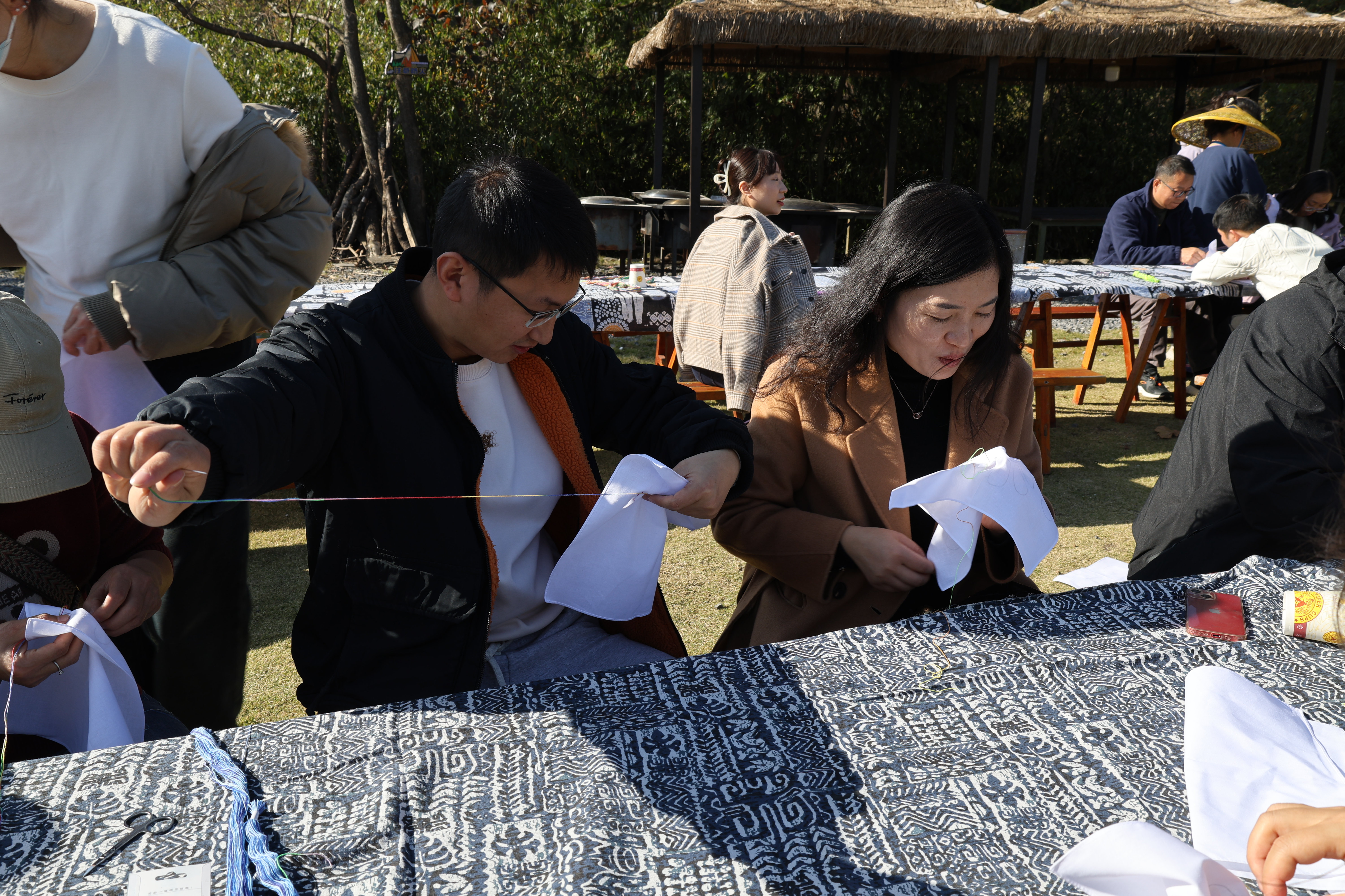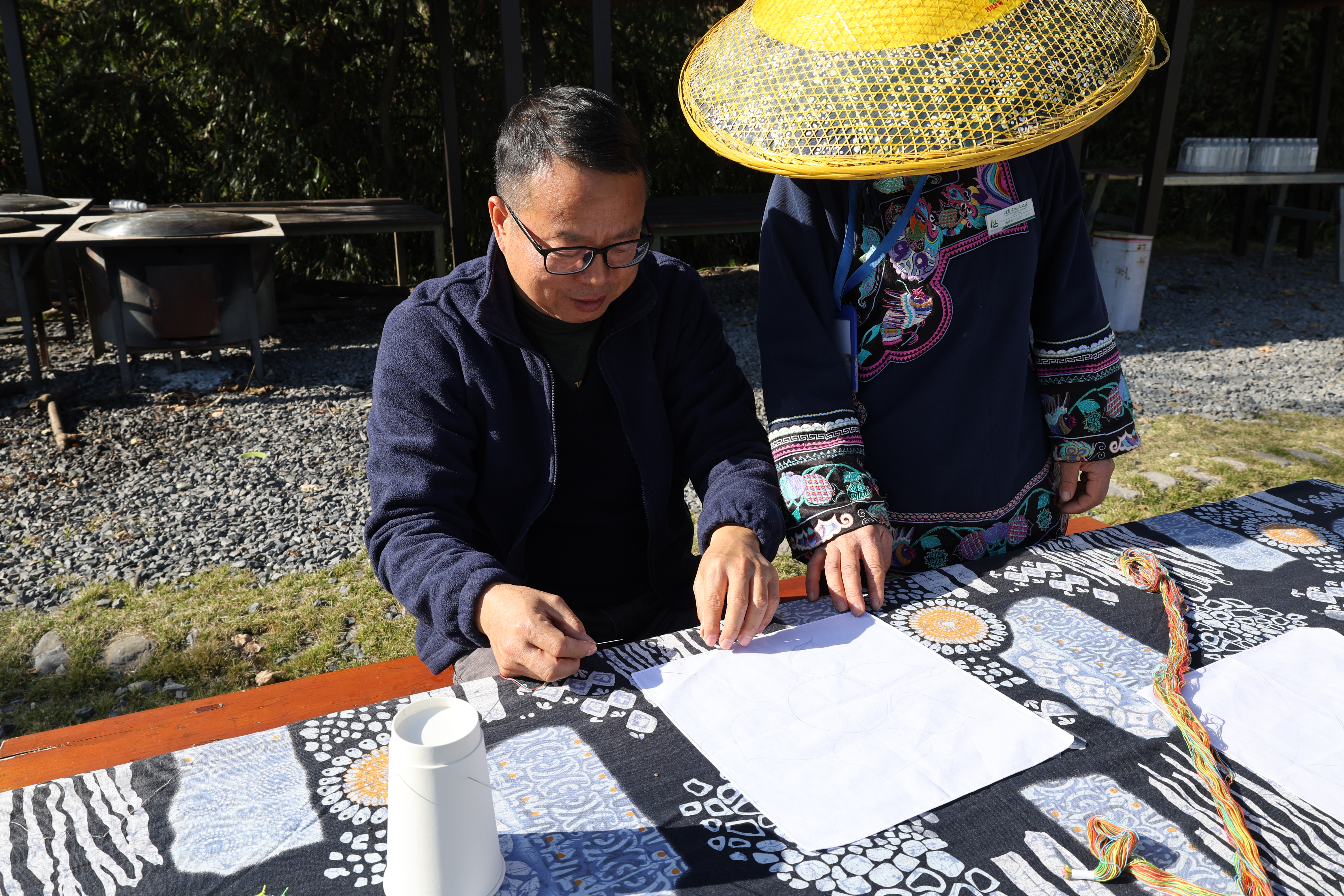 在随后开展的沉浸式扎染体验环节中,大家在传承人的悉心指导下,兴致盎然地投入到创作之中。从图案构思、折叠捆扎到浸染上色,大家亲手实践,在亲身体验中感悟非遗技艺的精妙和民族团结的真谛:正如每一件独一无二的扎染作品都需要各部分的紧密“扎”结与和谐共“染”,中华民族的灿烂华章也需要各民族儿女手挽手、心连心,同心同德、交融互鉴,共同“扎”牢团结之根,携手“染”就复兴画卷。