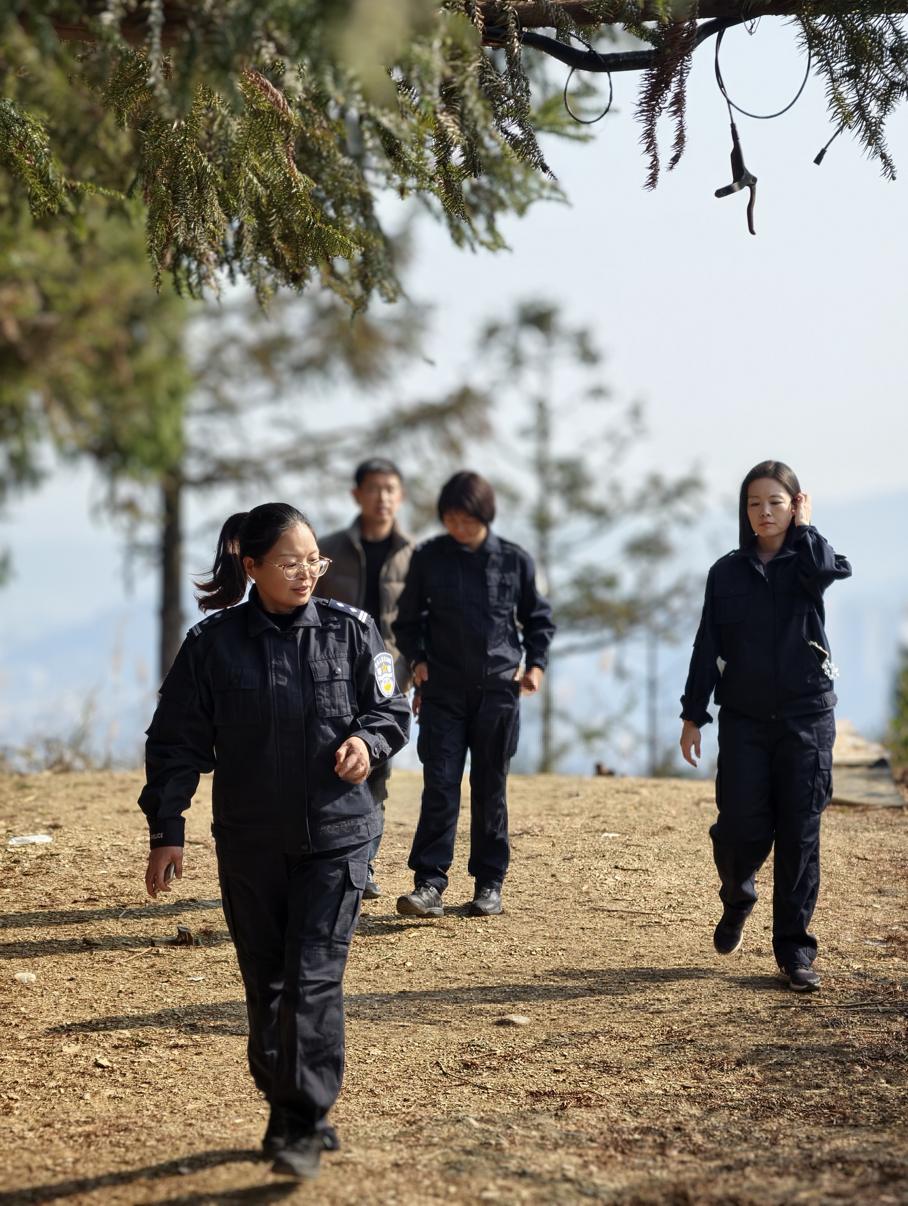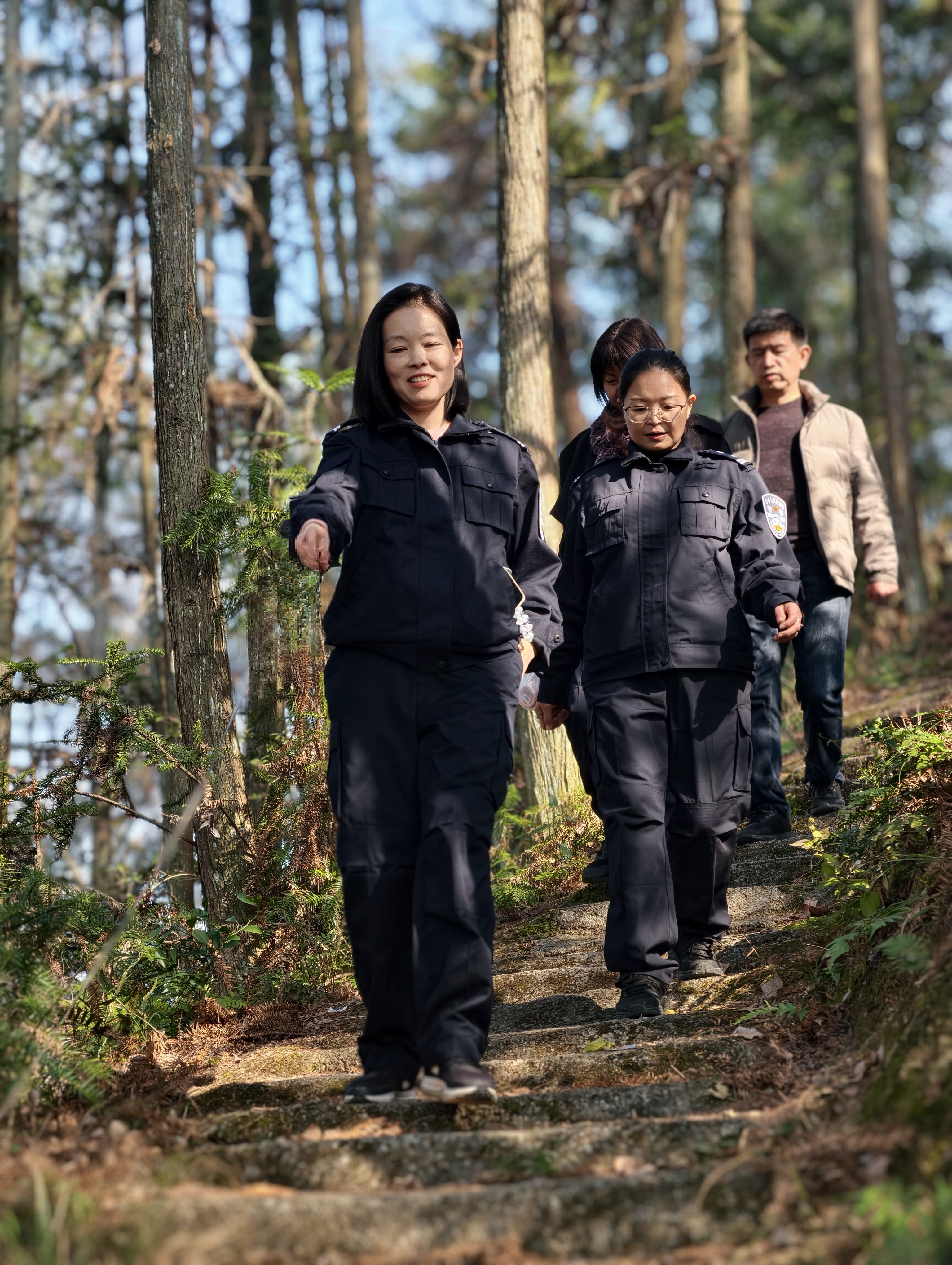 攀登途中,虽遇陡坡险段,但干警们斗志昂扬、互助前行。年轻干警主动帮扶体力稍弱的同事,资深警员沿途分享实战经验,“注意脚下碎石”“我拉你一把”的暖心话语回荡在山林间。大家边攀登边交流警务保障心得,从安检防控技巧到突发事件处置,从日常警务值守到专项任务攻坚,在并肩前行中深化了协作共识。阳光透过枝叶洒在警徽上,与干警们坚毅的身影共同勾勒出山间最亮眼的风“警”线。