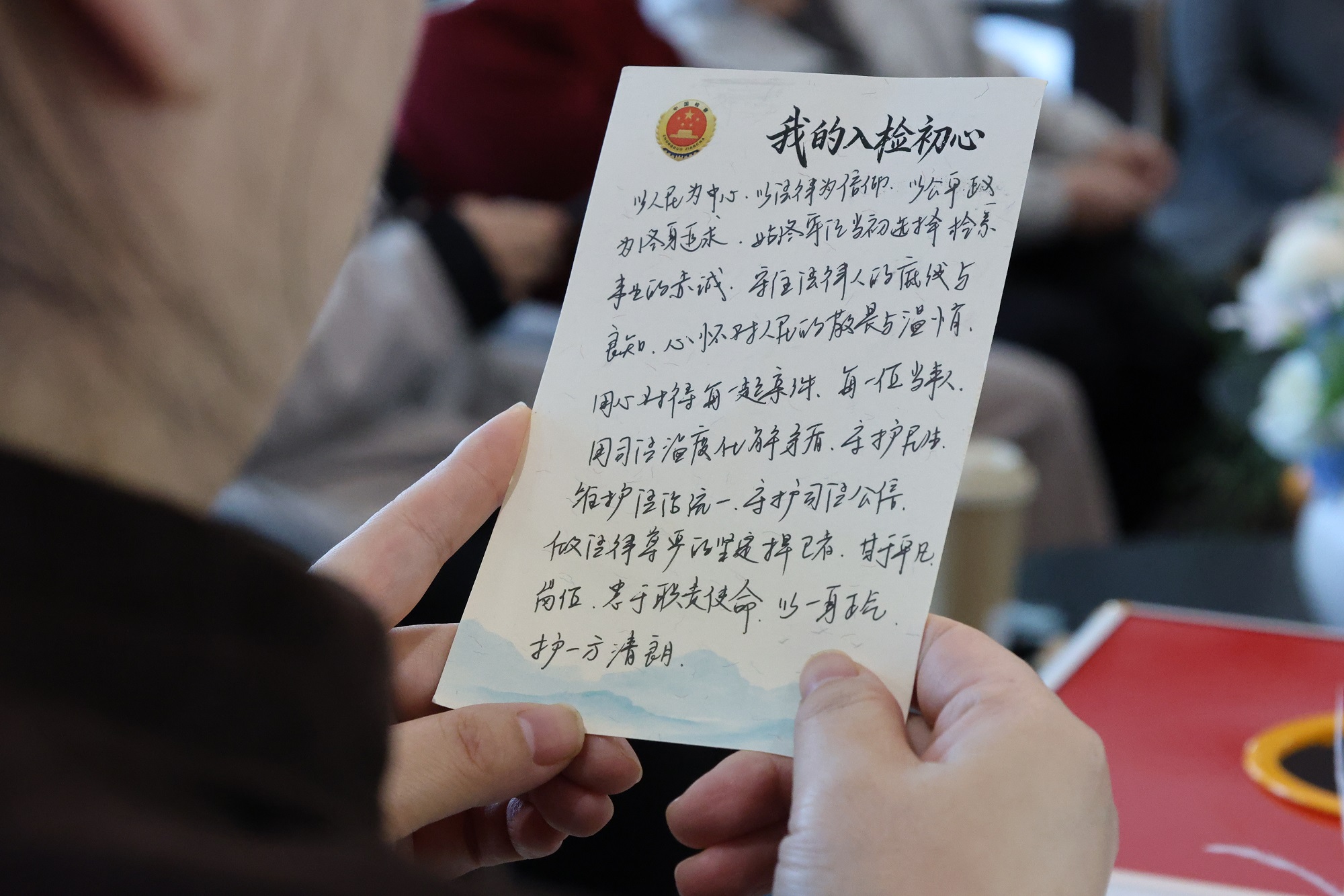 在初心共鸣盲读环节,检察前辈和主持人随机抽取前期匿名收集的一张张《我的入检初心》卡片,现场朗读: