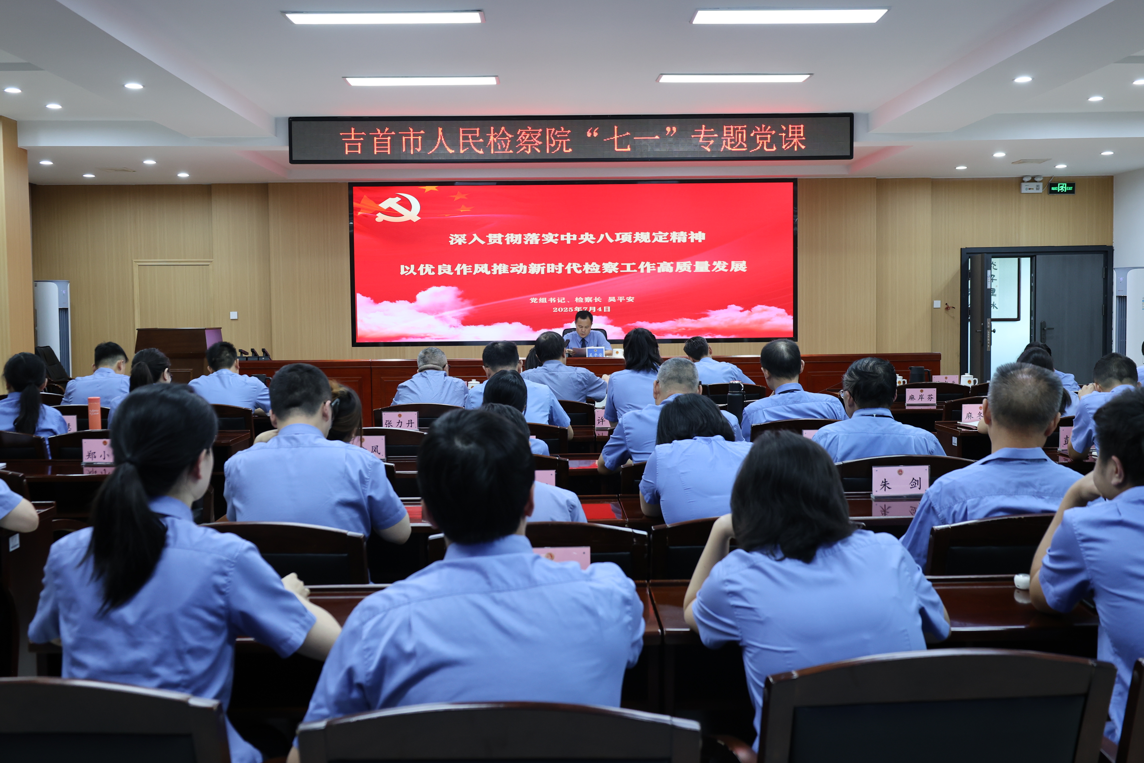 为庆祝中国共产党成立104周年,7月4日下午,吉首市检察院党组书记、检察长吴平安围绕《以优良作风推动新时代检察工作高质量发展》的主题,为全体检察人员讲授“七一”专题党课。