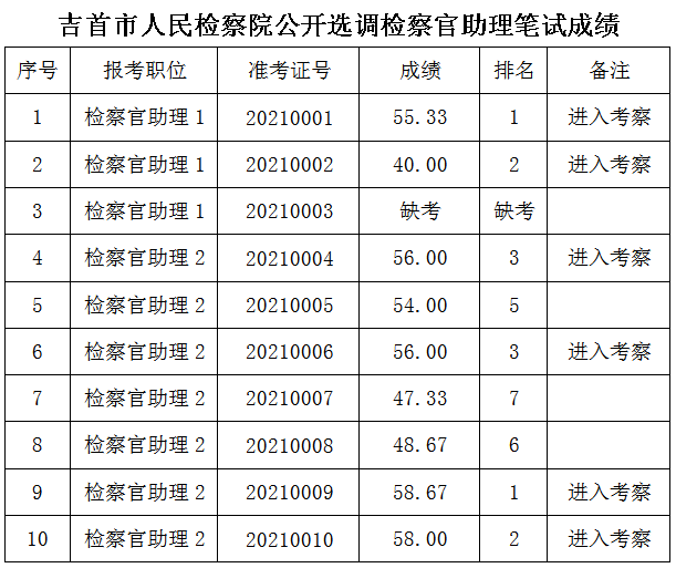 吉首市人民检察院2021年公开选调检察官助理笔试成绩公布