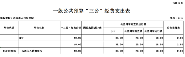 (二)“三公”经费预算:2022年本部门机关本级“三公”经费预算数为40万元,其中,公务接待费2万元,公务用车购置及运行费38万元(其中,公务用车购置费20万元,公务用车运行费18万元)。2022年“三公”经费预算较2021年持平。