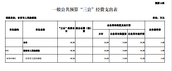 (二)“三公”经费预算:2024年本单位“三公”经费预算数为40万元,其中,公务接待费4万元,公务用车购置及运行费36万元(其中,公务用车购置费20万元,公务用车运行费16万元),因公出国(境)费0万元。2024年“三公”经费预算较上年持平,未超过上年预算。