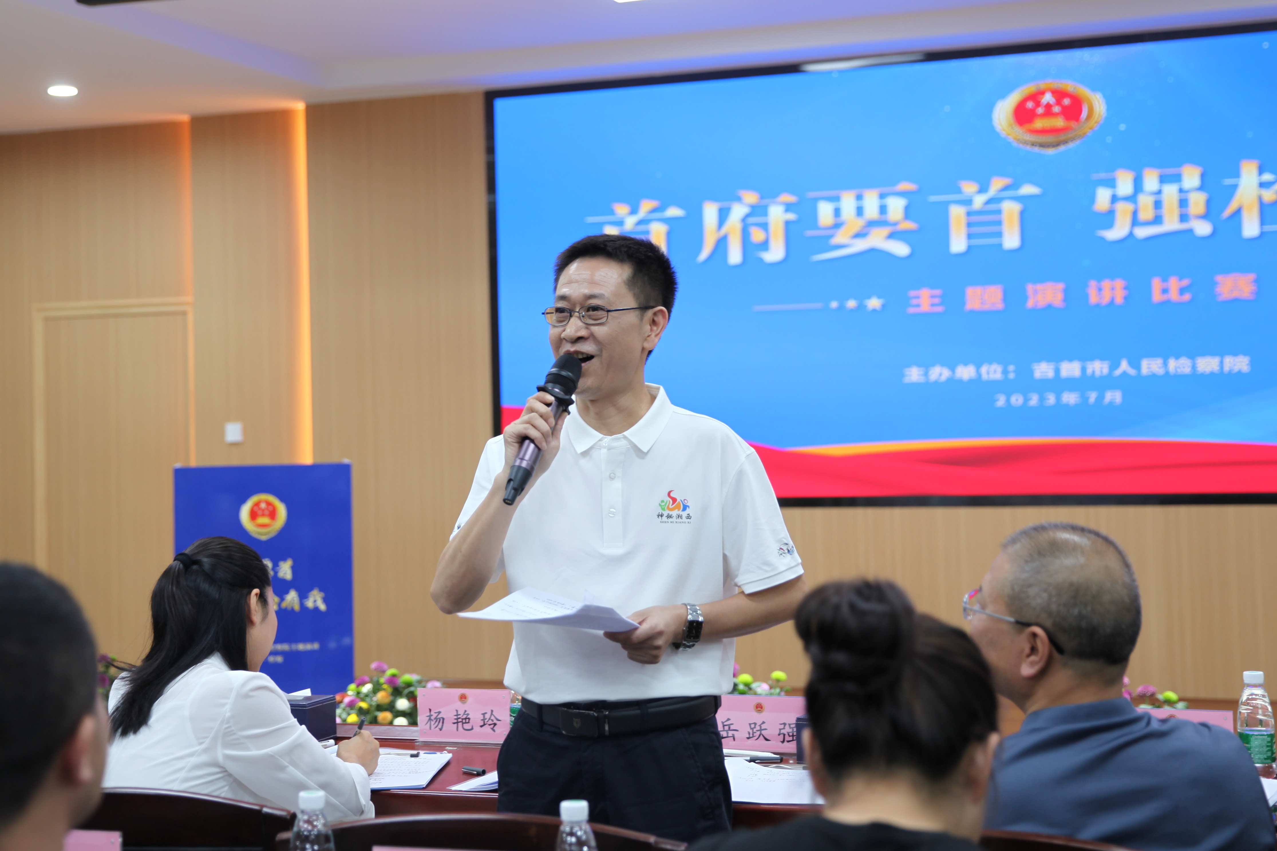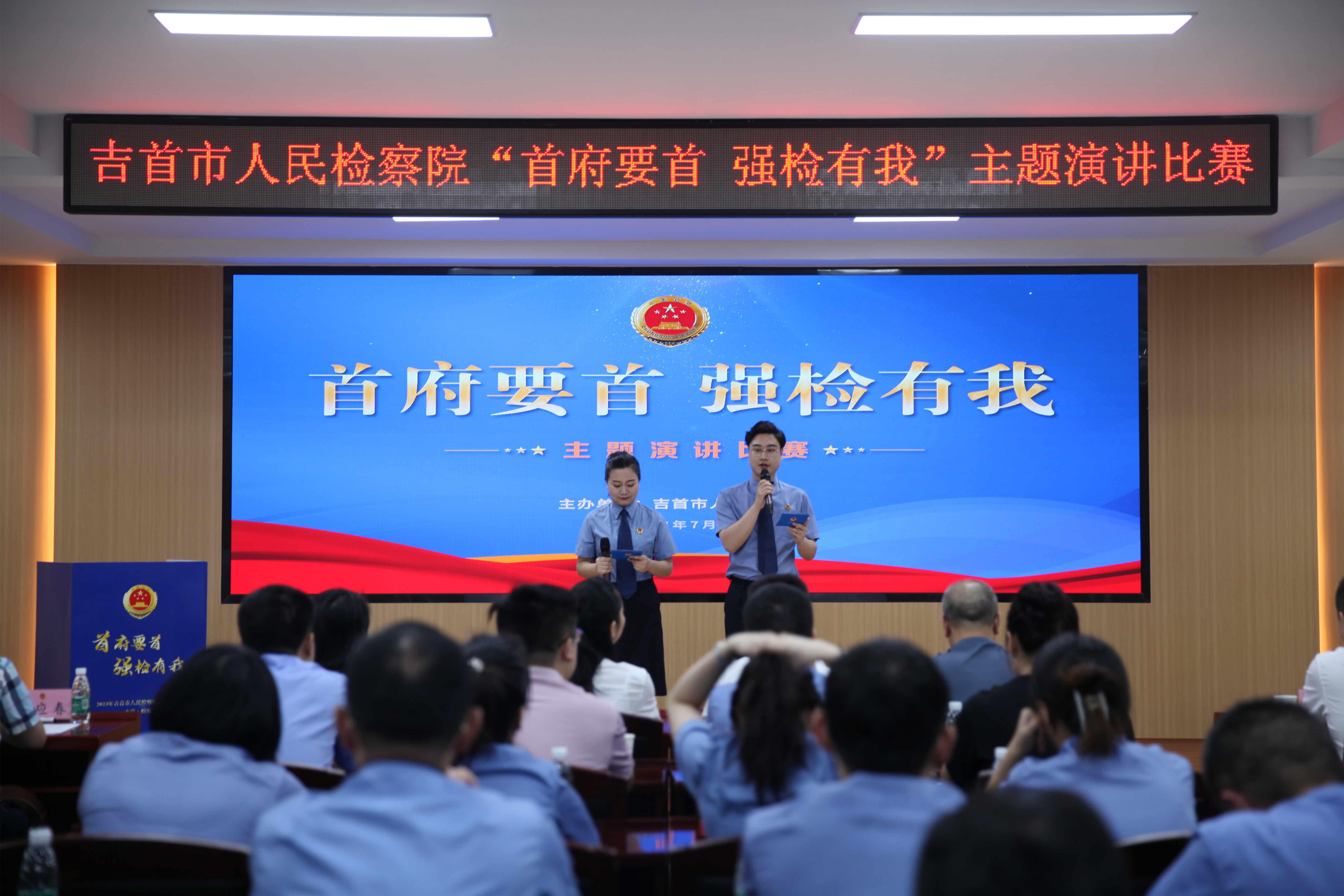 为进一步学习贯彻党的二十大精神,全面贯彻习近平法治思想,结合开展习近平新时代中国特色社会主义思想主题教育,切实增强检察干警履职尽责、担当作为的责任感、使命感。7月18日,吉首市人民检察院举办“首府要首 强检有我”主题演讲比赛。比赛邀请州委宣传部、州人民检察院、团结报社、州投促中心及吉首市人大常委会、市委组织部、市委政法委等单位领导担任评委,并邀请州人民检察院政治部、机关党委及吉首市人民法院、市公安局、市司法局政治部负责人观看比赛。